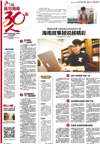 他曾把京华城、金龙路、椰风海韵、碧海银滩等海南元素写进小说。没想到引来一些细心的网友在网上留言,“柳大,你是不是在海南?”这些网友有的来自海南本地,有的来自省外。
