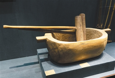 在海南岛农业文明发展中,脱壳工具扮演了重要的角色。“我们眼前的这个独木舂米臼和脱粒杵属于一套,它的制作工艺就是将一整个树干截取一段,然后利用火烧、石器打磨将树木截面逐渐挖出一个圆形坑,这就制成了舂米臼,脱粒杵也按照同样的工艺经过火烧、打磨制作而成。”罗文雄说。