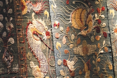 据介绍,龙被有五种形式,分别为:单幅龙被、双联幅龙被、三联幅龙被、四联幅龙被,五联幅龙被。其中,三联幅为居多,五联幅和单幅为最少。三联幅是由三幅彩锦联缀而成,一般长2米—3米,最长可达3.8米,宽1.1米—1.4米,以龙纹、凤纹、麒麟纹和鱼纹为主体纹样,花卉纹为辅。