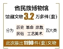 省民族博物馆馆藏文物3.2万多件套,分为历史、革命、宗教、民俗、工艺美术五大类,展出1190件(套)文物,在罗文雄看来,就是一幅数千年的民族画卷。