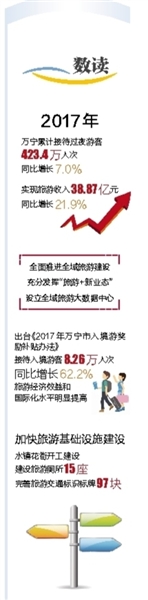 2017年,万宁全市接待旅游过夜人数423.4万人次,同比增长7.0%;实现旅游总收入38.87亿元,同比增长21.9%。