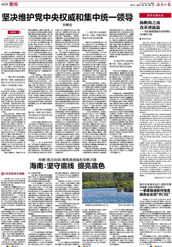 政治上维护核心。维护核心是检验党员干部政治觉悟和政治能力的试金石。我们说的维护核心,不是一时的,而是永恒的;不是时强时弱的,而是坚定不移的,要任何时候都毫不动摇保持对核心彻底的、无条件的、不掺任何杂质的绝对忠诚,时时、处处、事事向党中央看齐,向习总书记看齐。党的十九大一结束,海南立即以省委全会的形式出台了《中共海南省委关于认真学习宣传贯彻党的十九大精神的意见》,提出33条硬措施,引导全省广大党员干部旗帜鲜明讲政治,学懂、弄通、做实十九大精神,在政治立场、政治方向、政治原则、政治道路上与以习近平同志为核心的党中央保持高度一致,始终以党的旗帜为旗帜,以党的方向为方向,以党的意志为意志。