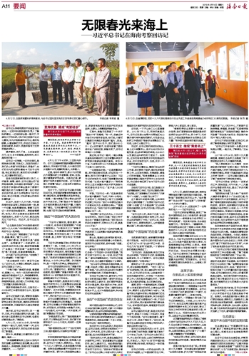 春牛春杖,无限春光来海上。4月的海南,天青海碧,花红柳绿,孕育着丰硕的希望。4月11日至13日,中共中央总书记、国家主席、中央军委主席习近平在出席博鳌亚洲论坛2018年年会有关活动后,在中共中央政治局常委、中央书记处书记王沪宁,海南省委书记刘赐贵、省长沈晓明陪同下,先后来到琼海、三亚、海口等地,深入农村、科研单位、政务中心,考察经济社会发展情况。