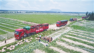 4月23日上午,文昌市龙楼镇全美村西瓜种植基地一片繁忙景象,几辆重型卡车停靠在田间地头,村民们忙着在地里采摘西瓜。记者了解到,龙楼镇原星光村村民黄循强在该村租了100亩地种植西瓜,如果销售顺利,他这一季西瓜可收获30余万元,纯利润可达10多万元。
