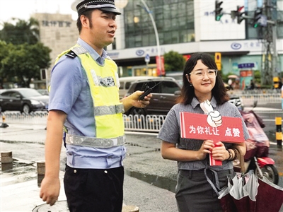 海口交警开展“礼让斑马线,为你点赞”文明交通活动。