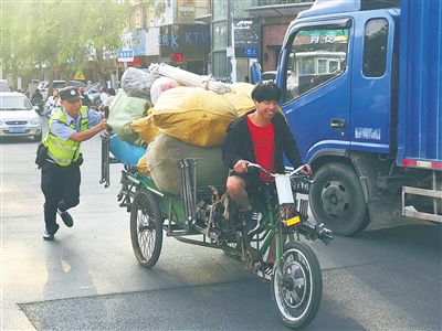 路管员帮群众将一辆装满货物的三轮车推过马路。