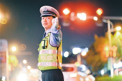 交警夜间指挥交通。
