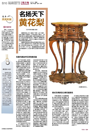 由于花纹美丽、色泽柔和、香味淡雅,海南黄花梨很早就被达官显贵、文人墨客视为珍玩。早在唐代,医药学家陈藏器在《本草拾遗》中说,“榈木出安南及南海,用作床几,似紫檀而色赤,性坚好”。宋代地理学家赵汝适在《诸蕃志》中说“土产沉香花梨木等,‘其货多出自黎峒’”。可见,至少在唐宋时期,黄花梨就与沉香、紫檀等,被列为贵重珍稀物产并推介。