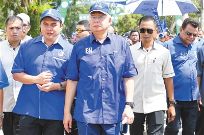 5月8日,在马来西亚彭亨州北干,现任马来西亚总理、执政联盟国民阵线领导人纳吉布(中)参加竞选造势活动。
