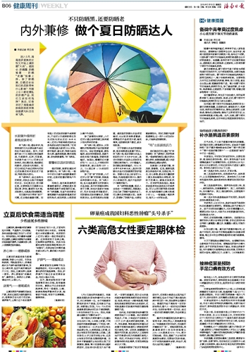 而日晒并非只带来“面子”问题,还会造成健康问题。如有些人的皮肤受到紫外线照射后,不但可以引起照射部位发生皮肤光变态反应(俗称光敏),还可以导致局部皮肤和全身免疫系统的功能异常。“还有一种情况是光致使DNA变性,破坏脂质、蛋白质,导致光线性角化病、基底细胞癌、鳞状细胞癌、恶性黑素瘤等。”林飞燕说。