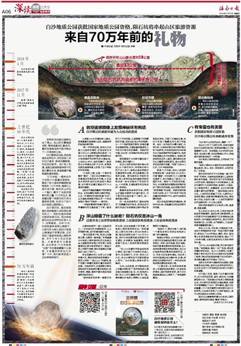 对于游人而言,造就了这次撞击的陨石,如今在历经发现、鉴定、确定后,也将重新回到白沙。“在知道白沙地质公园获批通过后,作为陨石发现者的王道经教授,将陨石无偿捐赠给了白沙。”罗长峰说,通过对这块重量3.75千克的富钙无球粒陨石进行分析研究,已在其中发现了55种矿物成分,其中4种此前尚未在地球上发现。