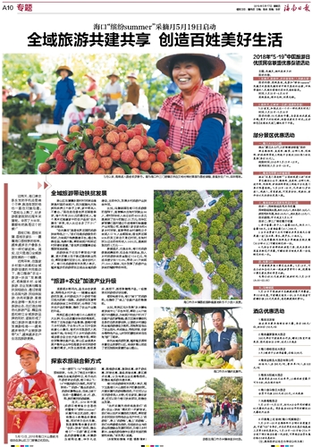 近两年来,在国家乡村振兴战略和全域旅游创建的共同推动下,海口围绕“农业+旅游+扶贫”发展模式,将美丽乡村、全域旅游、农业发展与精准扶贫相结合,通过培育生态观光游、民俗体验游、休闲采摘游、度假养生游等一系列乡村旅游业态,在打造出特色化旅游产品、精品线路和树立全域旅游品牌的同时,逐渐形成了海口旅游共建共享的发展新格局——越来越多特色产业被旅游带“火”,越来越多农户生活因旅游更美。