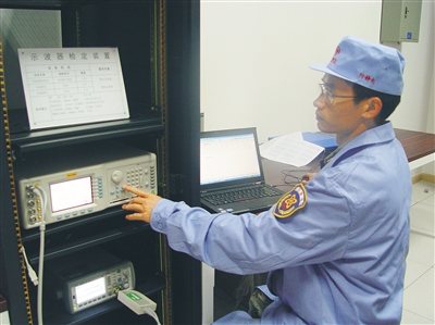 加油机、出租车计价器、医疗器具以及“民用四表”等民生计量领域的强制检定工作,切实保障了人民群众利益和生命财产安全。图为检定员正给出租车计价器上封签和贴强检合格证书。
