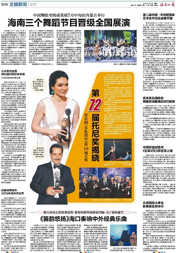 新华社纽约6月10日电 (记者杨士龙)第72届托尼奖颁奖典礼10日晚在纽约无线电城音乐厅举行,百老汇音乐剧《乐队造访》斩获最佳音乐剧,最佳音乐剧男、女主角和男配角以及最佳原创配乐等10项大奖。《乐队造访》改编自一部同名以色列电影,讲述了一个埃及乐队意外在以色列一个沙漠小镇过夜引起的故事。小镇居民和乐队成员均发现对方并非他们印象中的那个样子,大家因为对音乐和爱情的追求消解了文化的隔阂。