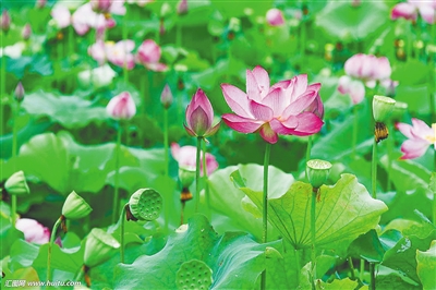 我把收集到的荷花、荷叶图片,在教室里用幻灯片展示出来。伴着优美的古筝曲,我们一面看图,一面读着宋代杨万里的《晓出净慈寺送林子方》。不用说,“接天莲叶无穷碧,映日荷花别样红”的美景已深深映在孩子们的脑海里。