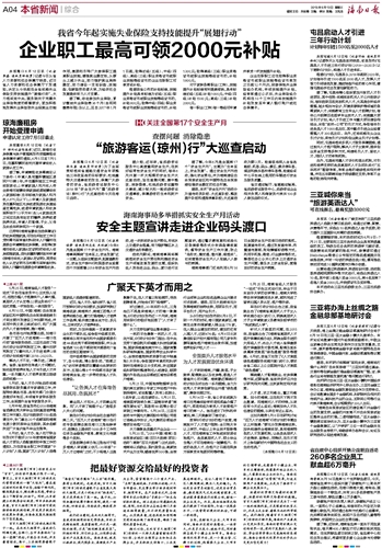 5月21日,中国地球物理学会在国内第五家院士专家工作站落户中科院深海所,该站配置人员有2名院士、5名专家,22名在读硕士。5月31日,海南医学院举办第二届青年学者“南海发展论坛”,现场有68名博士签订来院工作意向书。5月24日,三亚市政府与中国光大集团股份有限公司签订战略合作协议,光大集团总部经济等项目将落户三亚。