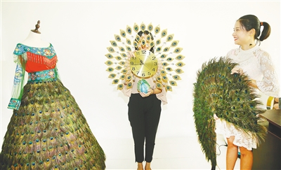 ■ 本报记者 林晓君 刘笑非 特约记者 谢振安孔雀造型挂钟、孔雀工艺品摆件、孔雀羽毛制成的婚纱……近日,在儋州芃虹农业有限公司的办公区里,琳琅满目的孔雀工艺品让人眼花缭乱。而这些用孔雀羽毛手工制成的工艺品,是26岁儋州女孩钟仙虹摸索出来的“美丽产业”。