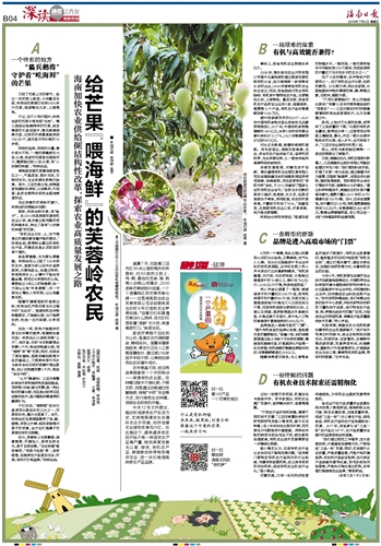 ■ 本报记者 林诗婷 袁宇盛夏7月,在距离三亚市区60余公里的梅东村芙蓉岭,约80亩的土地上,鸡、鸭、鹅自在觅食,猫、狗等小动物山间漫步,2000多株芒果树枝叶低垂,一个个透着桃红的芒果芳香沁脾——这是海南凯治实业发展有限公司总经理林英治历时8年打造的农业梦想田园。“别看它们和普通芒果没什么两样,但它们可是吃着‘海鲜’长大的,味道香甜可口。”林英治说。