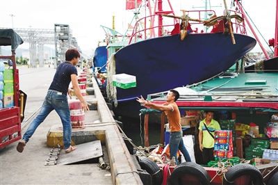 渔民在三亚崖州中心渔港补给,准备开渔。 海报集团全媒体中心记者 沙晓峰 摄