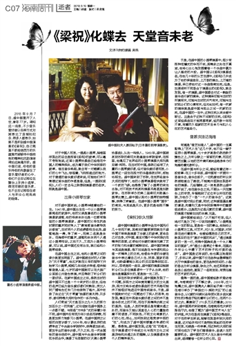 对于中国人而言,一提起小提琴,脑海里浮现出的总会是那首《梁祝》的旋律,可以毫不夸张地说,这首小提琴协奏曲已经烙在中国人的精神深处,成为属于我们中华民族的旋律。每当音乐响起,就会有一对蝴蝶从我们的心中飞出,徘徊着,飞向那遥远的地方。对于普通的音乐爱好者来说,可能他们并不清楚这首乐曲的作者是谁,但是,一提到《梁祝》,人们一定会马上联想到演奏者的名字,那就是盛中国。