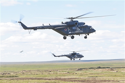 参加“东方-2018”战略演习的俄方直升机在俄罗斯楚戈尔训练场进行训练。 新华社发