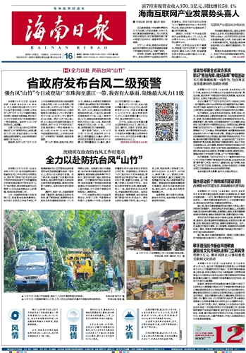 受“山竹”影响,陆地方面,预计16日,海南岛北半部地区有暴雨到大暴雨,南半部地区有大雨到暴雨。17日,全岛多云有阵雨、局地大到暴雨。此外,16日,海南岛北半部沿海陆地将伴有9级-11级大风,南半部沿海陆地风力7级-9级。海洋方面,16日,海南岛东部海面和琼州海峡风力可达11级-13级,其余大部海域风力可达9级-11级。17日起,各预报海区风力逐渐减弱。
