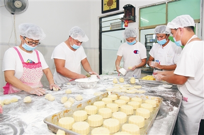 9月20日,金江老街一家老字号饼屋内,师傅们正在制作琼式月饼。 通讯员 李健 摄