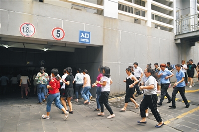 新城吾悦广场演练点参演人员紧急疏散到防空地下室,并集中隐蔽。