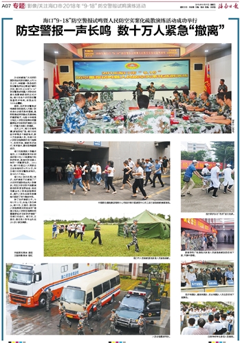为切实增强广大市民的国防观念和防空意识,9月18日上午,伴随着一阵急促的防空警报声划过椰城宁静的天空,海口市2018年“9·18”防空警报试鸣暨人民防空实案化疏散演练活动正式开始,海口市各个点的防空警报器同步鸣响,实现全市100%全覆盖。据悉,此次防空警报试鸣演练活动是深入开展人防实战化训练的具体措施,是积极推进军民融合发展战略的重要路子,也是今年海澄文地区人民防空指挥协同暨重要经济目标防护演练之后又一次重大年度人防演练。