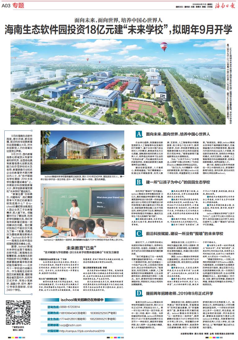 海南生态软件园投资18亿元建“未来学校”,拟明年9月开学