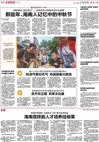 今天上午,记者在海南热带野生动植物园看到,园内游人如梭,携家带口的家庭游、大手拉小手的亲子游群体随处可见。毗邻热带野生动植物园的冯塘绿园,今天则开展了拜月、赏明月、吃月饼,庆丰收、庆团圆、猜灯谜等一系列“喜迎中秋,相约冯塘,穿越汉唐”的活动。海口的新旅游场所——海垦花园夜市、金盘夜市、欢乐海岸美食联盟等夜市成为不少市民游客游玩一天后的首选之地,在品尝各种美食之余,也体验一把海口城市更新的发展成果。