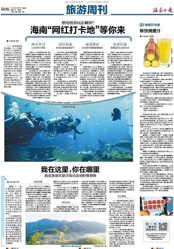 ■ 本报记者 赵优“十一”国庆黄金周近在眼前,不少人已经按捺不住内心对假期的向往,策划起了旅游攻略。海南哪些地方好玩又好看?还能在享受假期的同时美美地拍一组照片或者短视频,成为社交媒体的素材呢?海南日报记者注意到,我省多个景区和酒店成为网友的短视频主角,形成了滚雪球式的传播,一个又一个的“爆款”景点也引来了众多游客前来“打卡”。海南日报记者特意盘点了海南几大“网红打卡地”,让你也能用创意玩法刷屏朋友圈。