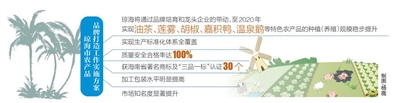 根据方案,琼海将通过品牌培育和龙头企业的带动,至2020年,实现油茶、莲雾、胡椒、嘉积鸭、温泉鹅等特色农产品的种植(养殖)规模稳步提升;实现生产标准化体系全覆盖;质量安全合格率达100%;获海南省著名商标及“三品一标”认证30个;加工包装水平明显提高;市场知名度显著提升。
