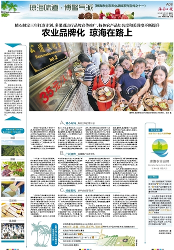 今年8月,琼海正式印发《琼海市农产品品牌打造工作实施方案》,并计划于3年内先行重点打造油茶、莲雾、胡椒、嘉积鸭、温泉鹅等5个农业品牌,推动特色农产品走上基地化、标准化、品牌化发展之路。