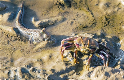 滩涂上的螃蟹享受阳光与食物。