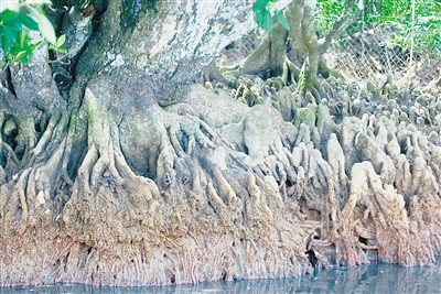“淤泥里氧气太少,红树植物们索性把部分根系裸露在空气中,直接呼吸新鲜空气。”管理局科研工作负责人介绍,这种呼吸根中间贯通着无数空隙、根皮上布满气孔,且大部分红树植物根系具有拒盐功能,这也使得它们成为唯一能够生长于热带地区沿海滩泥和海水中的绿色灌木。