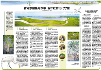 潮涨时,几乎全部淹没红树林枝干,只露树冠;潮落时,栖息于红树林内的鱼虾螺蟹纷纷从洞穴里探出脑袋,展翅盘旋于绿荫上的鹭鸟们自是循着味而来……在占全国红树林植物种类97%的植物群落里,208种鸟类、115种软体动物、160种鱼类、70多种虾蟹等甲壳类动物在此生生不息,从而构成一个封闭、完整的生态循环系统。