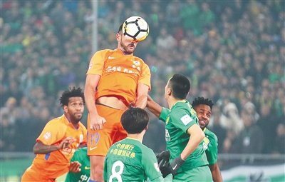 11月25日晚,在中国足协杯决赛首回合比赛中,北京国安队主场以1:1战平山东鲁能队。图为鲁能队球员佩莱(上)在比赛中争顶。新华社发