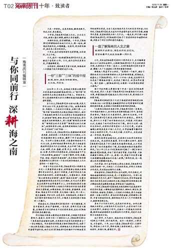 十年间,《海南周刊》坚持成为海岛新时代发展进程中的忠实记录者,以敏锐姿态反馈新热点、新知识、新生活,坚守原创性、耐读性、思想性、人文性的办刊理念,努力为读者提供一份真正有养分、有品位的深度读物;并将继续以原创、丰富与耐读的标准,捕捉海南历史与人文中的精彩亮点,映射海岛新生活。