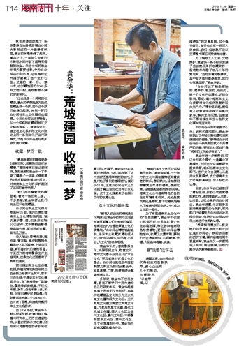 自1974年起,袁金华不断从民间发掘、收集、保护、整理与研究本土的历史遗留物件,从最初的碎片式收集,到后来以完善特定的体系来收藏;而这片园子,袁金华1990年便开始寻找,1992年找到了这片当时还是河岸荒坡的地方,于是开始了漫长的建园时光,直到2011年,这座白沙河谷本土文化园才真正走向社会与公众见面。这个文化园凝聚了他四十四年的收藏心血。