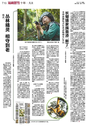 10年前,海南日报《海南周刊》率先报道了陈庆坚守霸王岭山区呵护海南长臂猿的故事,自此,海南长臂猿与陈庆被越来越多的人熟悉与关注。“关注的人多了,自己就会更觉得这是一件很有意义的事情,干这份活儿的动力也更足了。”经过陈庆等科研人员多年来不懈地观察、记录、保护,34年后,海南长臂猿也从最初仅存7只增加至28只。