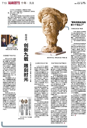 9年来,程连仲与《海南周刊》也建立起紧密的联系。来琼首个作品集出版、来琼首个个人雕塑作品展、为邵逸夫做雕像……程连仲回国后的每一步发展都记录在《海南周刊》上,一直与《海南周刊》携手前行。