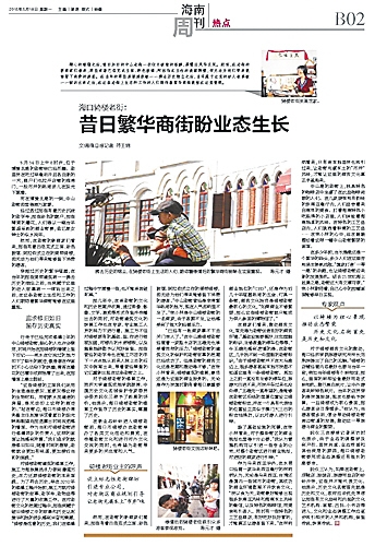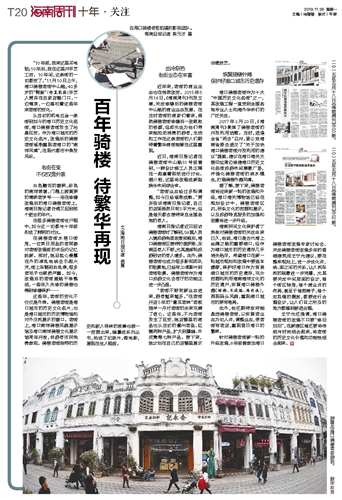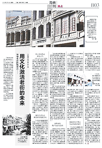 2017年3月20日,《海南周刊》聚焦了骑楼老街的开发利用话题。当时,适逢全省“两会”召开,致公党海南省委会递交了“关于加快海口骑楼老街开发利用的建议”提案,建议在海口海关大楼旧址周边修建海口历史文化名街旅游休闲集散广场,并强化骑楼老街的亲水概念,打造骑楼外滩风情。