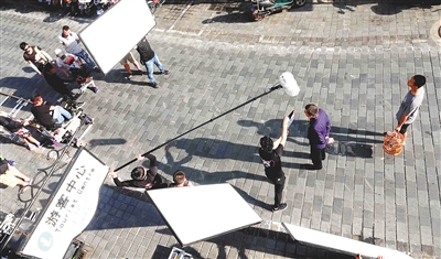 在海口骑楼老街拍摄的影视团队。 海南日报记者 陈元才 摄