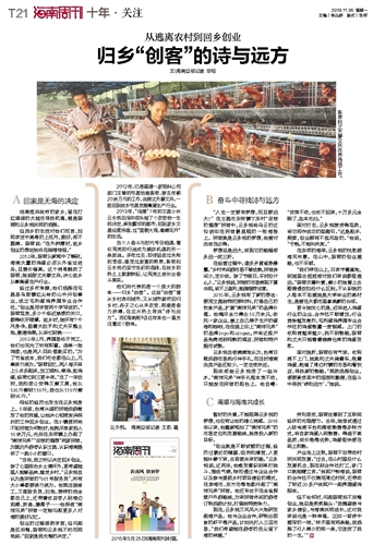 他们所代表的是一个庞大的群体——归乡“创客”。这些“创客”曾从乡村奔向城市,又从城市毅然回归乡村,赤子之心从未改变,那便是奋力拼搏,在这片热土寻找“诗与远方”。而《海南周刊》近年来也一直关注着这个群体。