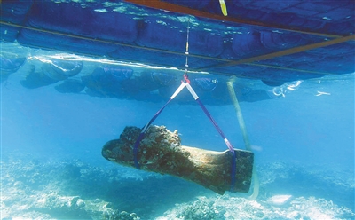 2015年4月16日,考古工作者对“珊瑚岛一号”沉船遗址的石构件进行打捞。通讯员 曾瑾 梁国庆 摄