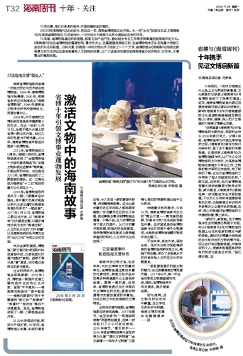 10年里,省博物馆通过积极策展、探索文创产品开发、推动相关考古工作等多种渠道挖掘海南历史文化。《海南周刊》也在省博物馆的重要时间、事件节点上,在重要展览亮相之时,在省博物馆考古队伍有重大突破之后给予关注并报道。日积月累,仿佛是一件件文物化作了纸张上一个个文字,省博物馆与《海南周刊》用彼此具有意义的方式讲述这座岛屿富有人文韵味的故事,让广大读者深切感受到海南建省办经济特区30年来,文博事业的蓬勃发展。
