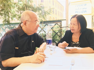 二O一八年六月,蔡葩在意大利博洛尼亚采访老华侨丁介正先生。