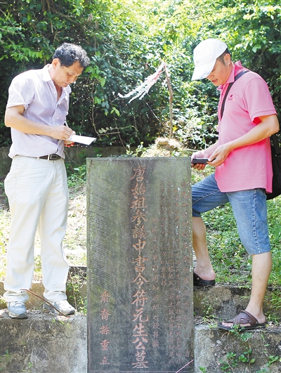 二O一二年五月二日,陈耿与文博专家踏访位于文昌龙楼的唐代渡琼始祖符元生墓。 海南日报记者 苏晓杰 摄