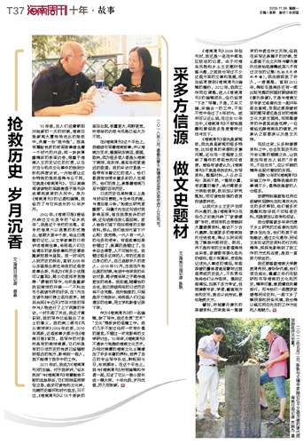 文\海南日报记者 陈耿《海南周刊》2008年创刊时,我还是一名在中部地区驻站的记者。由于对海岛风物和乡土文史题材很感兴趣,之前我也写过不少这些方面的文章和报道,因此经常接到《海南周刊》编辑的稿约。2012年,我因工作岗位调整,进入《海南周刊》的编辑团队,但仍经常“下水”写稿,于是,又采又编、采编合一的工作,不知不觉中走过了6年时光。或许可以这么说,在过去10年当中,《海南周刊》不断地提醒和敦促我多角度看待过往与当下。